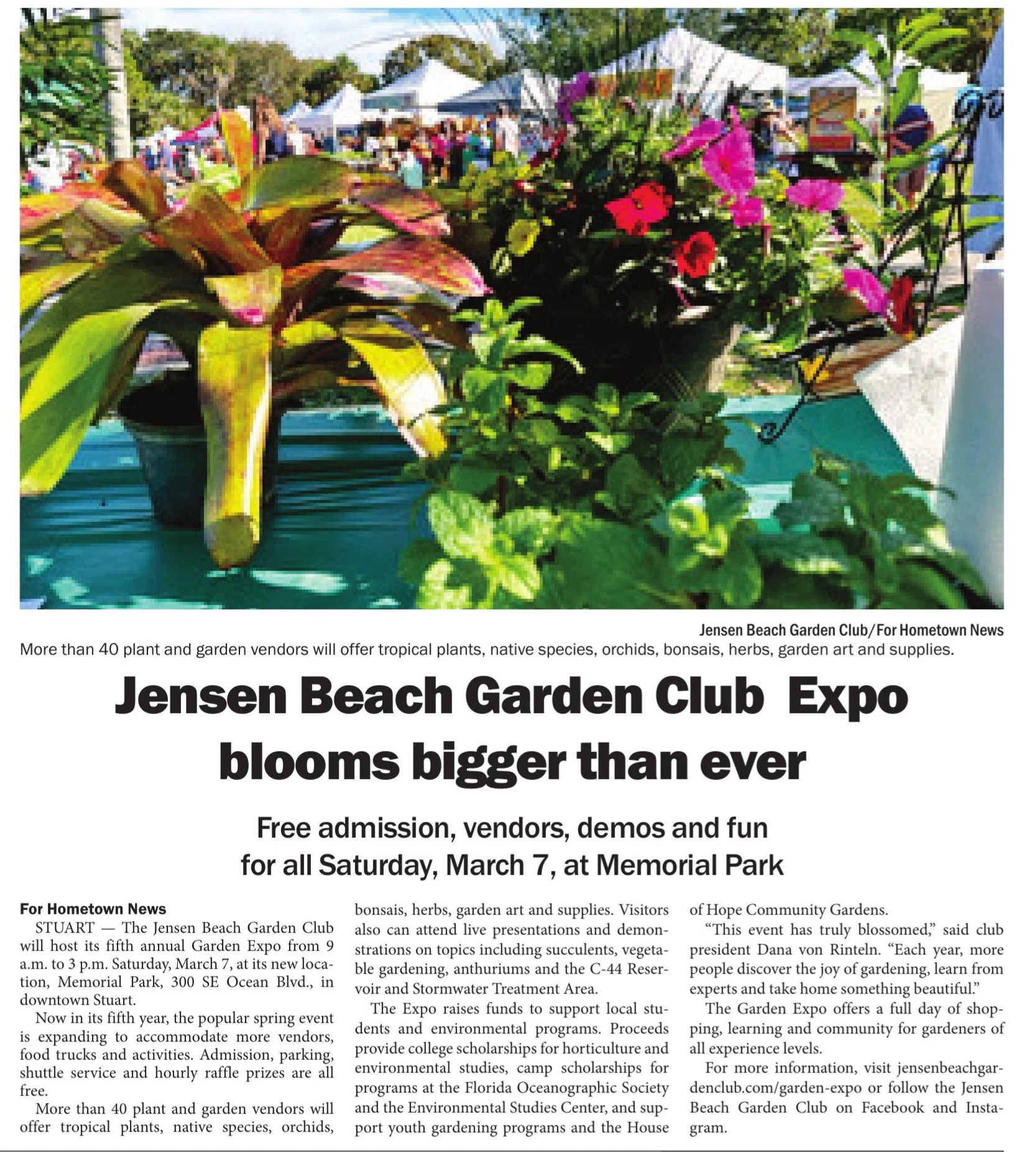 The Jensen Beach Garden Club is proud to support our local community by providing education, promoting environmental awareness and conservation, maintaining public gardens, and hosting our annual Garden Expos. We also champion native plant restoration, protect pollinators, and fund scholarships and summer camperships to inspire the next generation. We are honored when our efforts are recognized in newspapers, magazines, and other media outlets. Here’s a look at recent coverage that highlights our club’s community impact and activities.